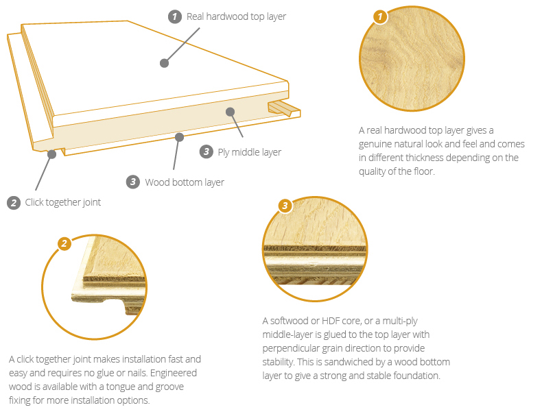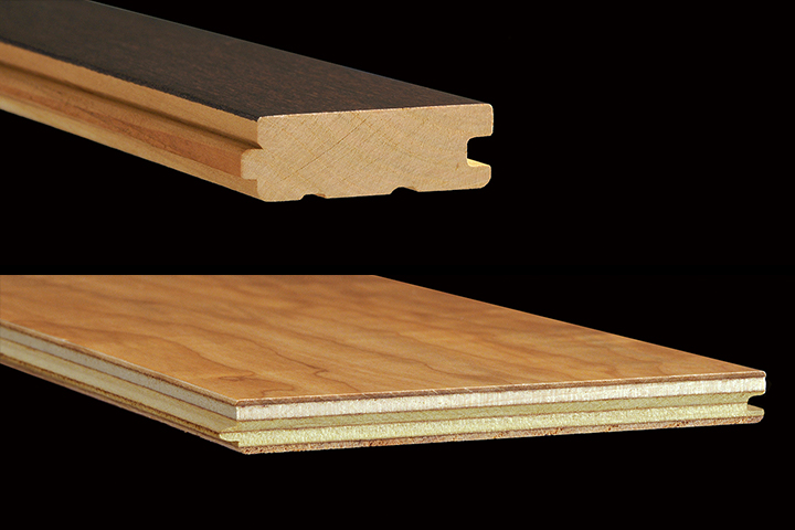 Engineered wood flooring has a layered structure: wood top and backing with a strong, stable core made from cross layers of pressed plywood. This structure makes engineered wood flooring a great choice for basements, over concrete subfloors and over radiant heating systems. Depending on top layer thickness, some engineered floors can be sanded and refinished. Engineered construction creates a highly stable core that is less likely to expand, contract or shift when exposed to moisture, humidity and temperature. This makes engineered wood flooring a great option in rooms that are subject to moisture (like basements) or over concrete slab and radiant heating systems.